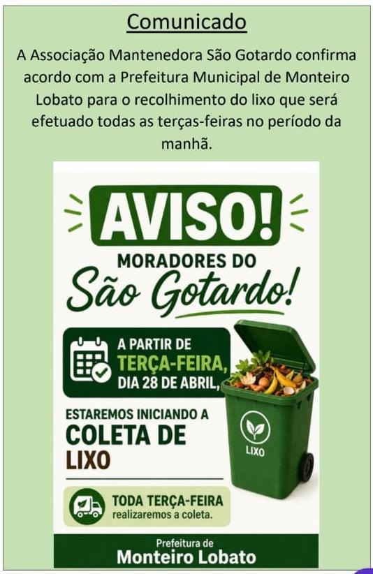 A Associação Mantenedora São Gotardo informa aos proprietários do Loteamento Alpes de São Gotardo que a Prefeitura Municipal de Monteiro Lobato iniciou a cobrança do IPTU referente aos imóveis localizados no referido loteamento.